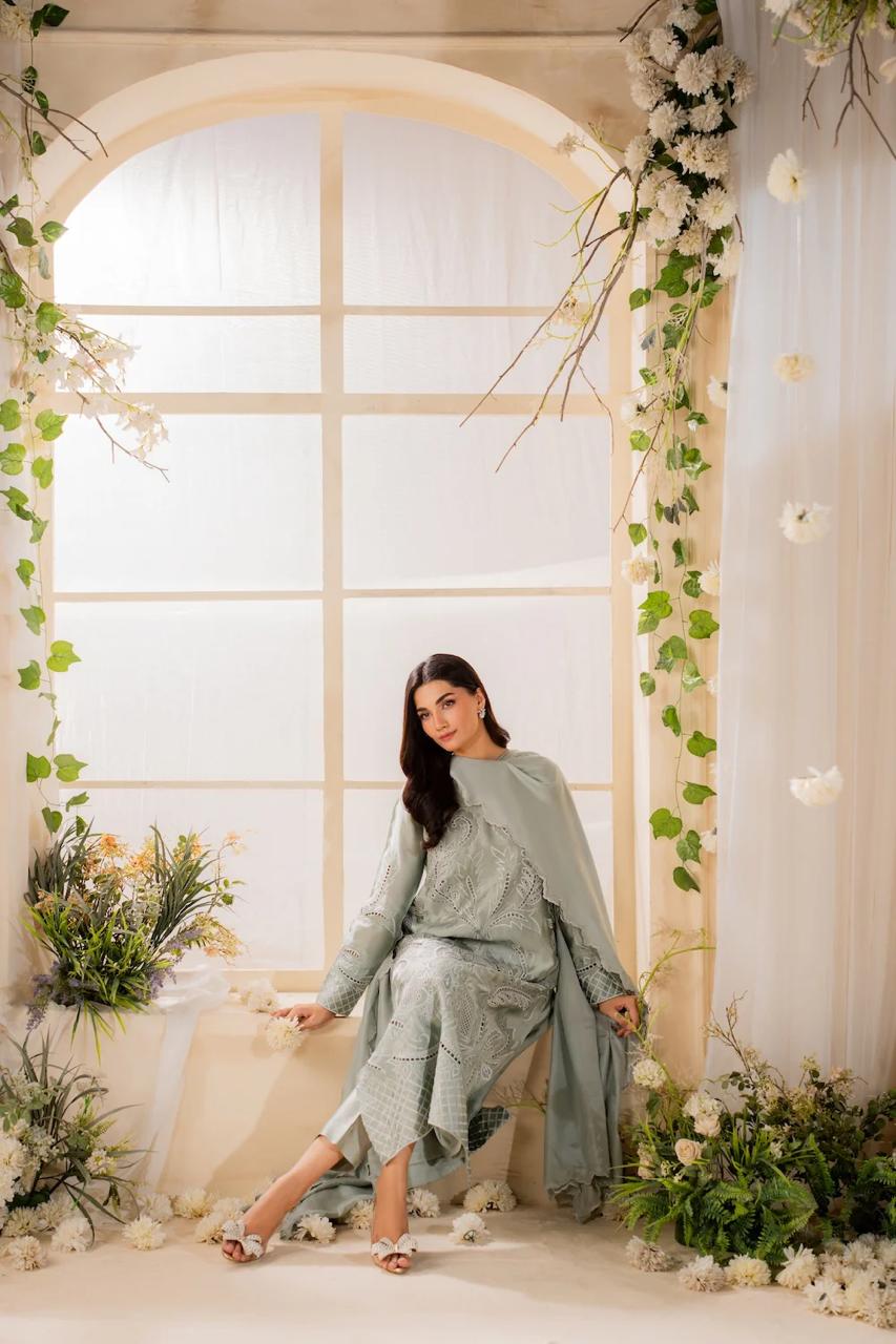 Imagine the serene beauty of Sufaira , an elegant embroidered 3-piece dress crafted from Premium Linen. Featuring a long-length shirt adorned with intricate embroidery and paired with a stylish trouser, this outfit is designed to offer both comfort and a flattering fit.